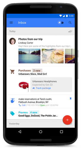 «Inbox подчеркивает ключевую информацию из важных сообщений, таких как маршруты полетов, информацию о событиях, фотографии и документы, присланные вам по почте друзьями и родными», - добавил он. - «Inbox даже отображают полезную информацию из интернета, которой не было в оригинальной электронной почте, например, статус полета в режиме реального времени или доставки товаров. Система работает так, чтобы дать вам необходимую информацию с первого взгляда».