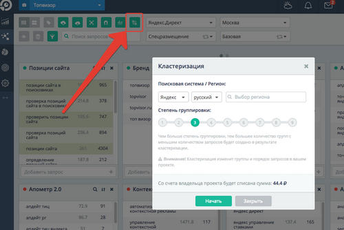 Допускается степень группировки от 1 до 9. Чем больше степень группировки, тем большее количество групп с меньшим количеством запросов будет создано в результате кластеризации. Оптимальная степень кластеризации 2-3: