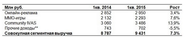 Компания Mail.ru Group представила годовой отчет и итоговую аудированную отчетность за 2014 год, а также предварительные неаудированные данные по сегментной выручке за первый квартал 2015 года.