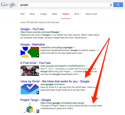 Дэнни Салливан (Danny Sullivan), редактор и основатель Marketing Land и Search Engine Land, искал «Apple» в Google, а затем выбирал дополнительную опцию «Видео». При этом результаты поисковой выдачи совпадают с результатами непосредственного поиска в Google Видео. Второй и третий пункт сообщают о наличии видео-контента на страницах, но ни одна из них не содержит видео.