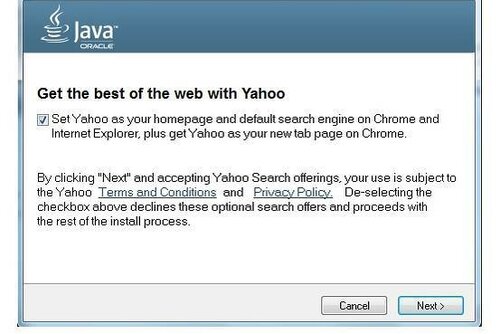 Флажок установлен по умолчанию, так что пользователи должны снять его, чтобы отказаться от установки Yahoo. Те из них, которые торопятся установить Java, могут быстро пролистать экран и случайно переустановить настройки браузера. Однако пресс-секретарь Yahoo утверждает, что процесс вовлечения пользователей обладает высокой прозрачностью и дает пользователям выбор.