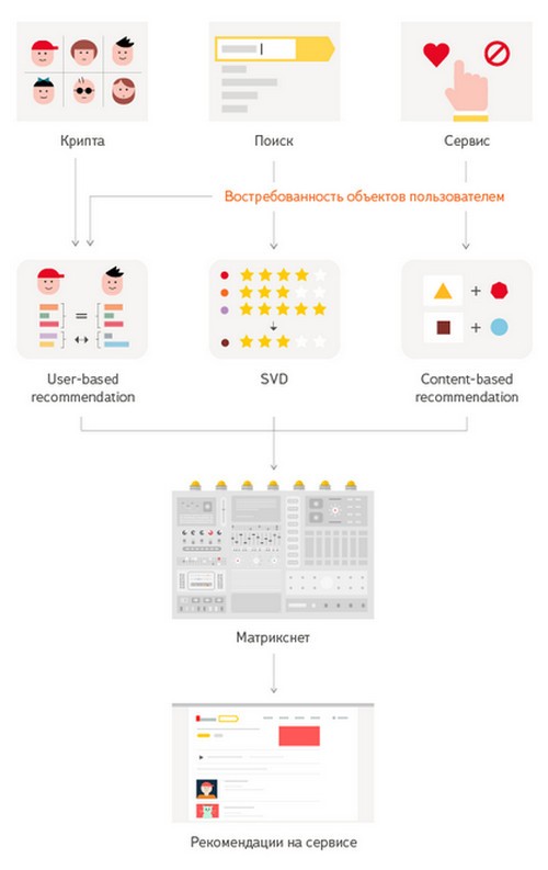 Все рекомендации от различных моделей обрабатывает метод машинного обучения Матрикснет. Его задача — составить сочетание рекомендаций, которое бы идеально соответствовало интересам пользователя в данный момент.