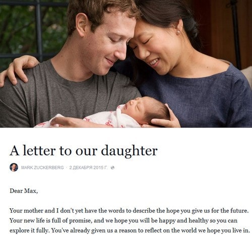 В письме Цукерберг сообщает о своих планах постепенно передать 99% акций Facebook, принадлежащих ему и его жене Присцилле Чан, на благотворительность. Сам основатель Facebook и его жена займутся развитием благотворительной организации Chan Zuckerberg Initiative, основанной ими в 2009 году. Фонд рассчитан на создание равных условий развития для детей по всему миру, в частности, он занимается проектами, связанными с борьбой с различными заболеваниями и повышением доступности образования.