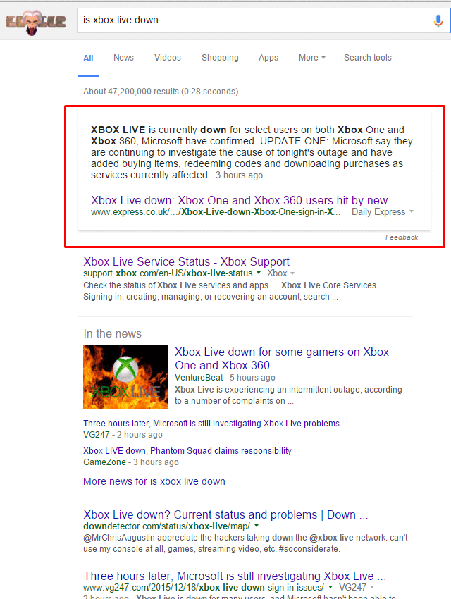 Один из специалистов отрасли, Майк Фридмен (Mike Friedman), опубликовал скриншот расширенного ответа Google, который содержал фрагмент новостной заметки о падении сервиса Xbox Live: