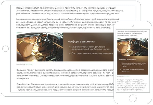 SlickJump Video позволяет показывать тематическую видео-рекламу аудитории конкретных тематических статей, а не просто «сквозным» размещением. Настройки таргетинга позволяют искать подходящий контент как по ключевым словам, так и по тематикам, интересующих пользователей здесь и сейчас. Видеоконтент размещается слева, справа или в «теле» текста, ненавязчиво подстраиваясь под его визуальный стиль с возможностью брендировать подложку под запросы клиента. Таким образом, решается проблема традиционных баннерных навязчивых роликов, которые «сдивигают» основной материал.