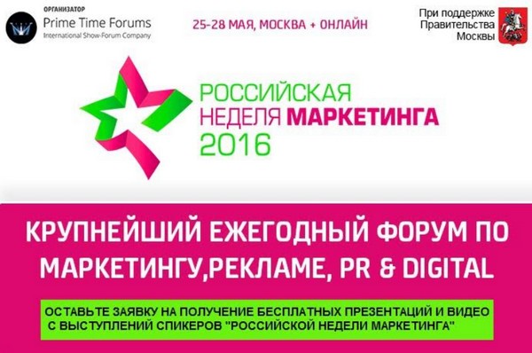 «Российская Неделя Маркетинга» – главное событие для собственников бизнеса, директоров по маркетингу, рекламе и PR, состоится в Москве и онлайн по всему миру в мае 2016 года.