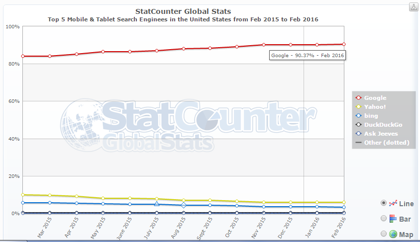 При этом с каждым месяцем статистика, собираемая comScore, всё меньше отображает реальную ситуацию в отрасли, поскольку поиск становится всё более мобильным и фрагментированным. По данным StatCounter, в мобильном сегменте Google занимает более 90% рынка: