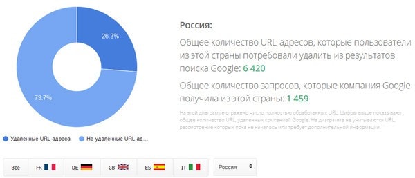 За время действия закона Google получила из России 1459 запросов на удаление ссылок, количество адресов, перечисленных в этих запросах, составило 6420 штук.