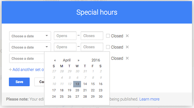 Напомним, что в ноябре 2015 года Google Мой бизнес позволил предпринимателям заранее указывать режим работы компании в праздничные дни. Прежде внести временные изменения в график работы можно было только в конкретный день, а изменить обратно – лишь на следующий.