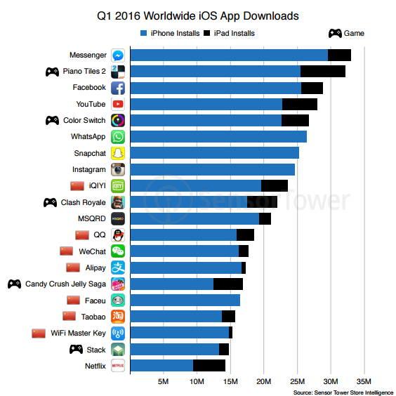За период с января по март 2016 года число загрузок из Google Play выросло до 11,1 млрд; из App Store – до 6,1 млрд. Повторно скачанные пользователем или установленные на несколько устройств приложения аналитиками компании не учитывались.