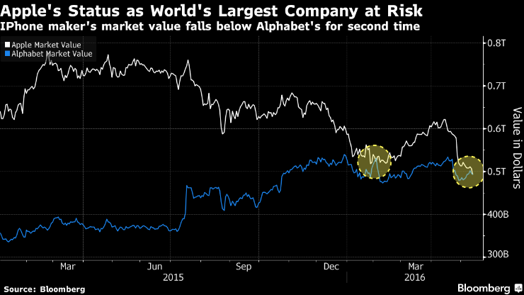 12 мая 2016 года акции Apple подешевели на 3% до менее чем $90 за бумагу и рыночная капитализация компании упала до $493 млрд, согласно данным Yahoo Finance. Оценка стоимости Alphabet на вчерашний день составляла $498 млрд. На сегодня эти цифры равны $495 млрд и $500 млрд соответственно.