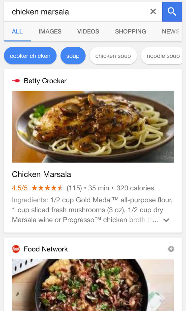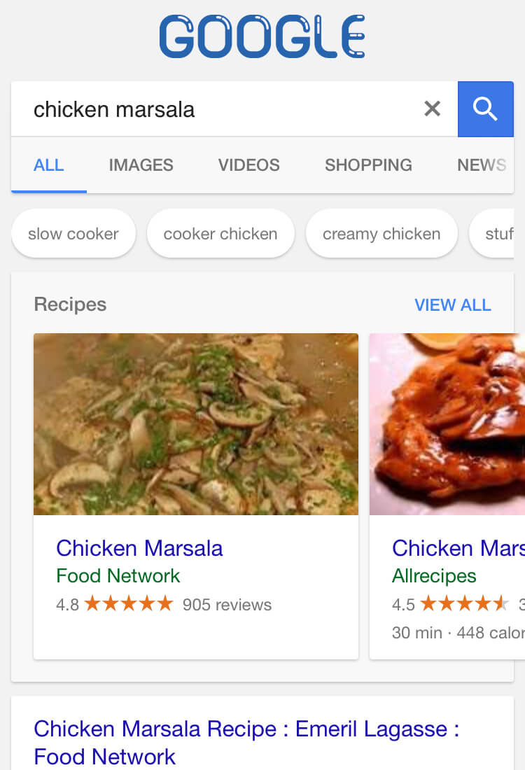 Теперь при поиске рецепта в результатах поисковой выдачи отображается карусель карточек со ссылкой «View All» («Посмотреть все»):
