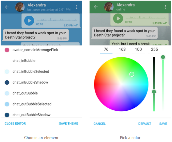 Telegram обновил своё приложение для Android, добавив поддержку пользовательских тем.