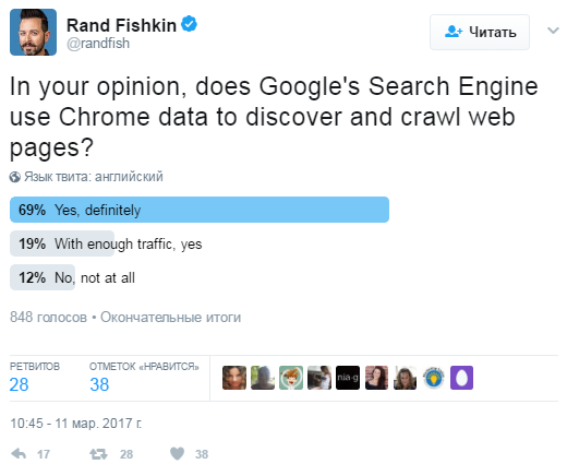 В ожидании результатов исследования Рэнд Фишкин из Moz опубликовал в Twitter следующий опрос: «Как вы думаете, поисковая система Google использует данные Chrome для обнаружения и сканирования веб-страниц?».