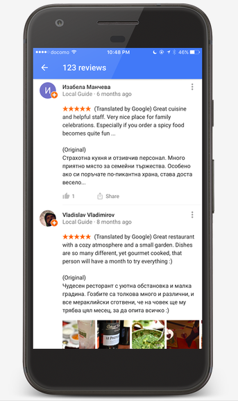 Перевод будет производиться автоматически при поиске в Картах Google или в поисковом приложении. Отзывы будут отображаться на том языке, который установлен на устройстве. Сначала будет показана переведённая версия, а затем – оригинал: