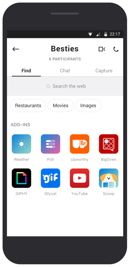 Ещё одним нововведением станет вкладка Find в чатах. На ней можно будет искать информацию с помощью Bing и добавлять ботов в конференцию.