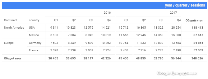 Сводные таблицы позволяют сужать большой набор данных и анализировать связи между точками данных. Кроме того, они реорганизуют измерения и метрики, помогая быстро суммировать данные и видеть связи, которые в противном случае было бы трудно обнаружить.