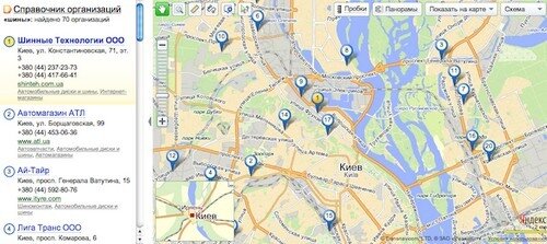 Приоритетное размещение позволяет выделить свою компанию на Яндекс.Картах особой цветной меткой и добавить к стандартному описанию рекламное объявление. Кроме того, по соответствующим запросам организация может занимать в списке рядом с картой более выгодную позицию. Например, как киевская компания по продаже шин, уже попробовавшая новый продукт.