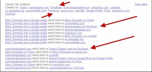 Это мои контакты с Барри Шварцем, моим новым редактором здесь на Search Engine Land. Получается, что я связан с ним каким-то контентом из Фейсбука двумя различными способами (две красные стрелки).