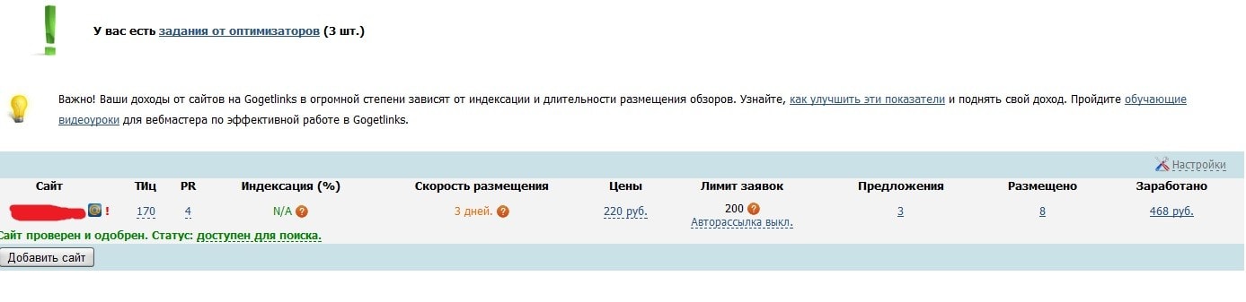 Вернули в gogetlinks статус "активен для показа", цена средняя, поступает 1-2 заявки в сутки