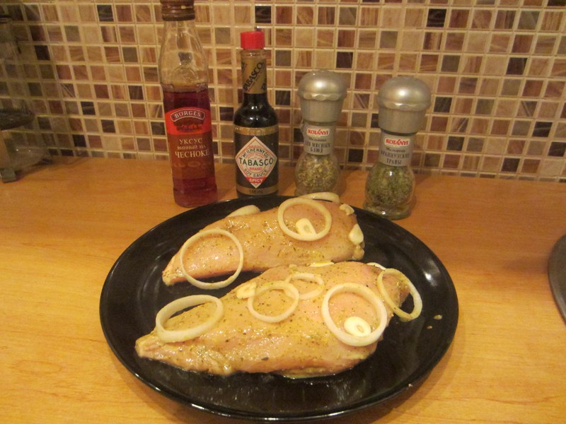 1. Берем филе курицы, обмазываем горчичкой, поливаем винным уксусом на чесноке, добавляем соевый тобаско, обильно посыпаем приправами для мясных блюд и французскими травами, сверху нарезаем и кладем лук и чеснок, оставляем мариноваться.