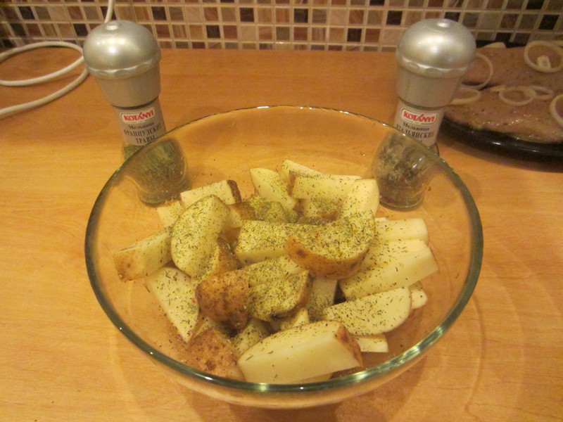 2. Тщательно моем картошку, режем на средние дольки вместе с кожурой, опять тщательно моем, кладем в глубокую миску, посыпаем приправами и перемешиваем.