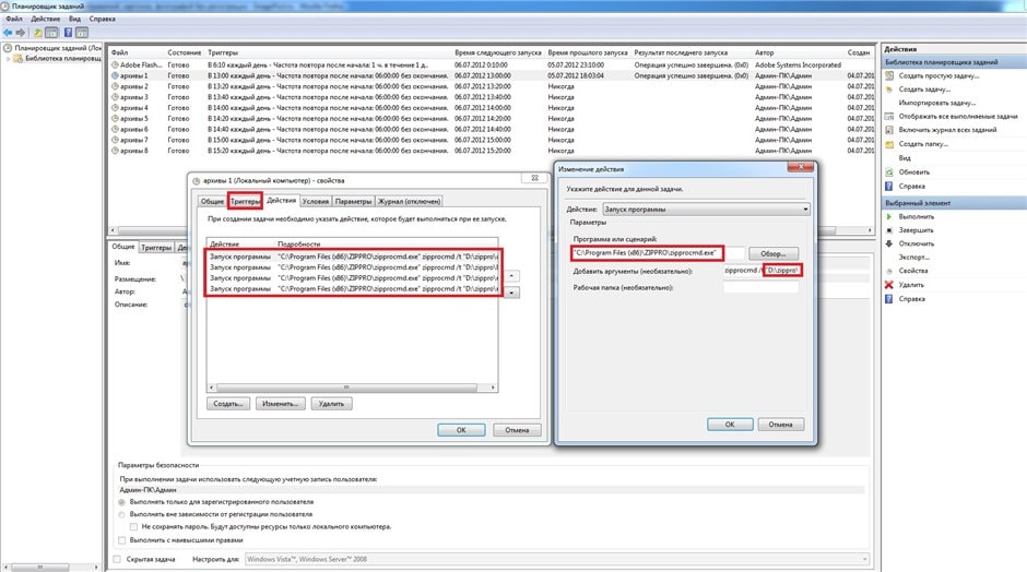 В файле cmd прописываются все параметры хостинга, соответственно, указываю в планировщике программу с помощью которой выполнять сценарий, она идет вместе с прогой от zippro, файл zipprocmd.exe, а в аргументы вставляю код из сценария, который у нас создается к каждому архиву.