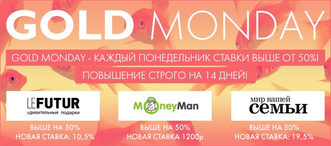 GOLD MONDAY — это эксклюзивное повышение ставок от 50% и выше каждый понедельник от Рекламодателей, которые готовы достойно вознаграждать своих партнеров! Повышение строго на 14 дней!