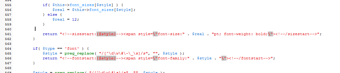 return "<!--sizestart:{$style}--><span style=\"font-size:" . $real . "pt;\"><!--/sizestart-->";