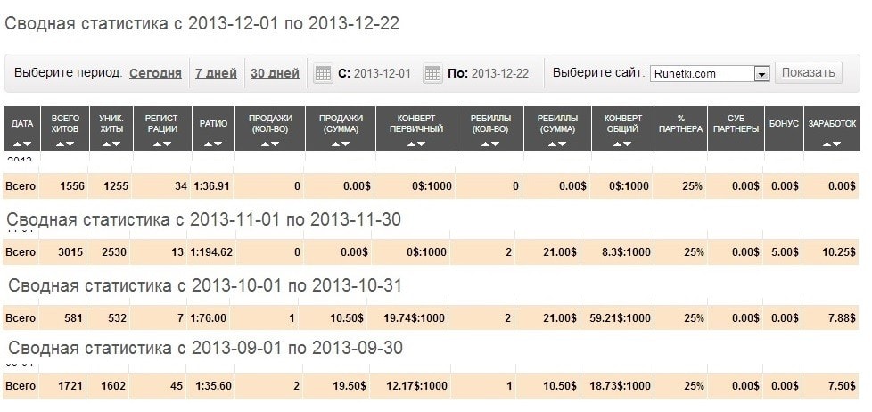 99 регистраций за 4 месяца принесли 900 рублей.0,08 рубля на регистрацию в день.На копеечном wmmail рефералы раз в 100 больше приносят.---------- Добавлено 23.12.2013 в 19:24 ----------Абсолютно провальная партнёрка.Я так и подумал вначале, что никто не будет платить 70 рублей за минуту видео, но почитал отзывы, говорят платят, решил попробовать.Ну и где платят?За 4 месяца набрал половину минималки.И качество трафика тут не при чём, оно влияет на отношения переходы/регистрации, а толк от партнёрки - прибыль/регистрации (8 копеек).---------- Добавлено 23.12.2013 в 19:32 ----------
