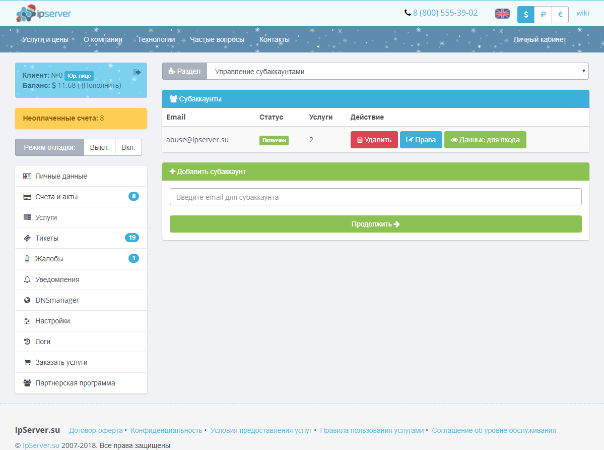 Рады сообщить, добавлена функция создания субаккаунтов. Теперь Вы можете предоставить Вашим сотрудникам или доверенным лицам ограниченный доступ к Личному Кабинету, предварительно настроив права доступа к определённым разделам. Например, разрешить доступ к Тикетам и Счетам.