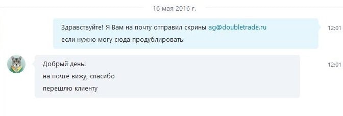 месяц назад Я вел разговор и по телефону и по скайпу с Вашим сотрудником (Александр Агеев Doubletrade) все что меня просил Я в свою очередь предоставил, а потом спустя две недели попросил: Просим приехать в наш московский офис для Вашей полной идентификации и подтверждения каналов генерации продаж (счетчики на сайтах, статистика из тизерок, контекста, соцсетей и т.п.). Не бред ли? И то что Я живу от Вас 3000км. Я в со своей стороны все доказательства предоставил, а Вы в свою очередь не дали мне не какой отчет, а просто взяли и удали акаунт и постарались удалить всю переписку в скайпе, но все скрины Я сделал вовремя.