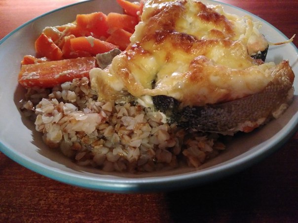 Рыба горбуша, запечённая в сметане с сыром, луком и свежей морковью, на гарнир - гречка с жаренным луком.