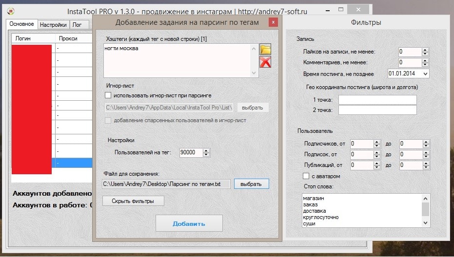 - стоп-слова: для отсеивания магазинов а так же других коммерческих аккаунтов, и для парсинга еще более качественной аудитории были добавлены стоп-слова. Суть в том, что парсить не будет тех пользователей, в описании страницы которых будут найдены стоп-слова. Каждое слово должно быть задано с новой строки. К примеру - для отсеивания интернет-магазинов можно использовать следующие стоп-слова - "магазин заказ доставка круглосуточно суши shop" и тд.
