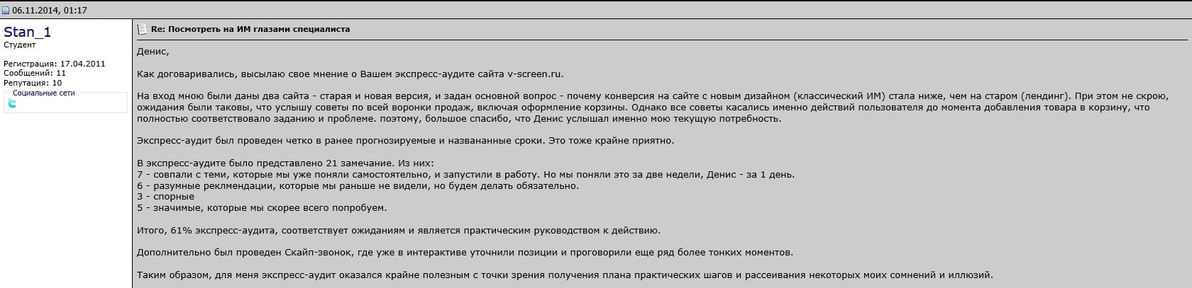 Еще раз хотим напомнить, что мы не берем в работу заказы типа "зацени". Аудит занимает достаточно много времени и сил, поэтому проводить аудиты впустую, без какой-либо пользы для проекта, желания нет. Вы должны понимать, какие проблемы сайта должен решить аудит. Цель нашего бесплатного аудита - решить конкретные проблемы юзабилити, а следовательно и конверсии интернет-магазинов, и прочих проектов, продающих товары или услуги.
