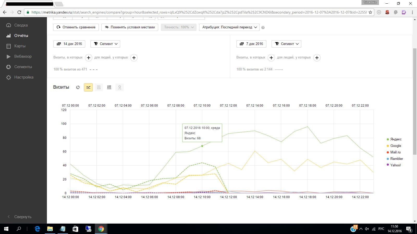 С 10:00 утра двукратное падение трафика с Яндекса, по сравнению с четвергом прошлой недели. Гугл - напротив, вверх.
