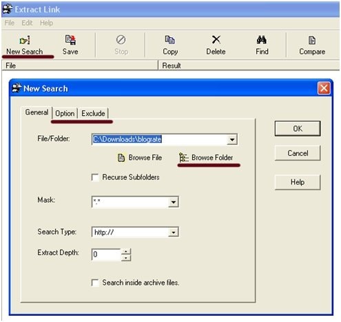 5. После того, как все html-страницы сохранились, нам нужно выдрать из них ссылки на блоги, для этого используем Extract Link. Нажимаем кнопку «New Search», выбираем папку с сохраненными html-страницами, на вкладке Option отметьте галочками «Remove duplicate results» и «Remove duplicate base», на вкладке Exclude/Exclude Text напишите построчно feedburner.com и blograte.ru, чтобы в базе было меньше ненужных урлов: