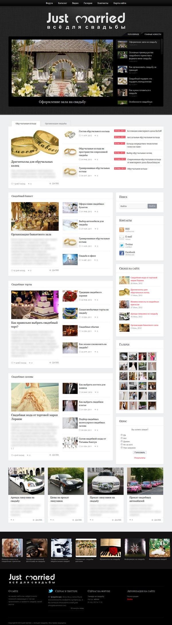 Фотогалерея: 100 тематических изображений в 4 галереях (свадебная церемония, свадебные платья, свадебный картеж, свадьбы знаменитостей). Изображения уникализированны методом «зеркалирования» + через админку можно поставить водяные знаки с url сайта.