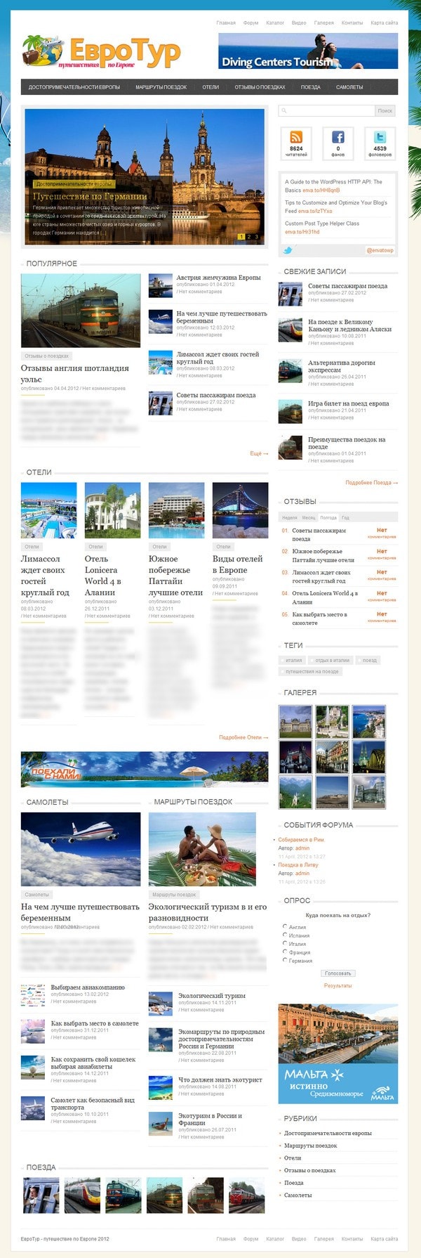 Статьи: 111 тыс. знаков б.п., 70 уникальных тематических статей (Визы, Поезда, Отели, Отзывы о поездках, Маршруты поездок, Достопримечательности Европы и т.д.) Статьи разбиты по категориям, что сделает удобным добавление новых материалов. К каждой статье прилагается тематическое изображение, изображение имеет имя вида: uspeh.jpg