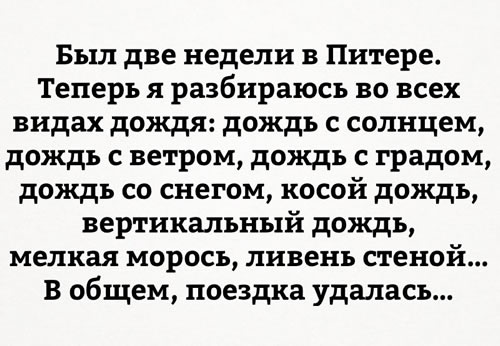 Если смотреть в общем, то у нас один вид дождя - всегда в лицо.. Снег такой же 🤪