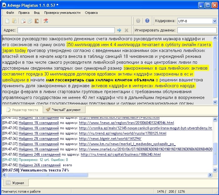 Проверка программой Advego Plagiatus показала 74% уникальности.
