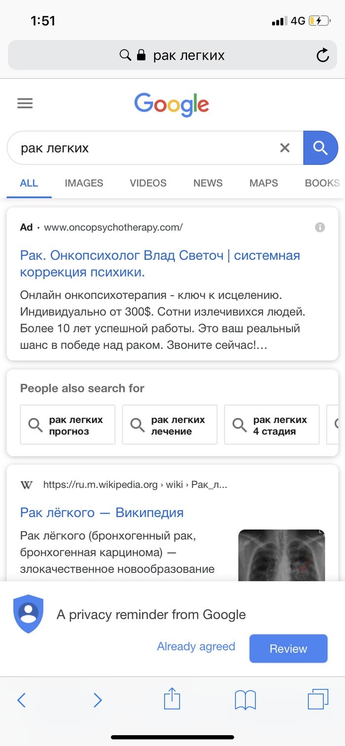 Сегодня нарвался на пост на известном ресурсе. Человек возмутился тому, что у него вылезло по запросу "рак легких". А точнее, возмутила реклама: