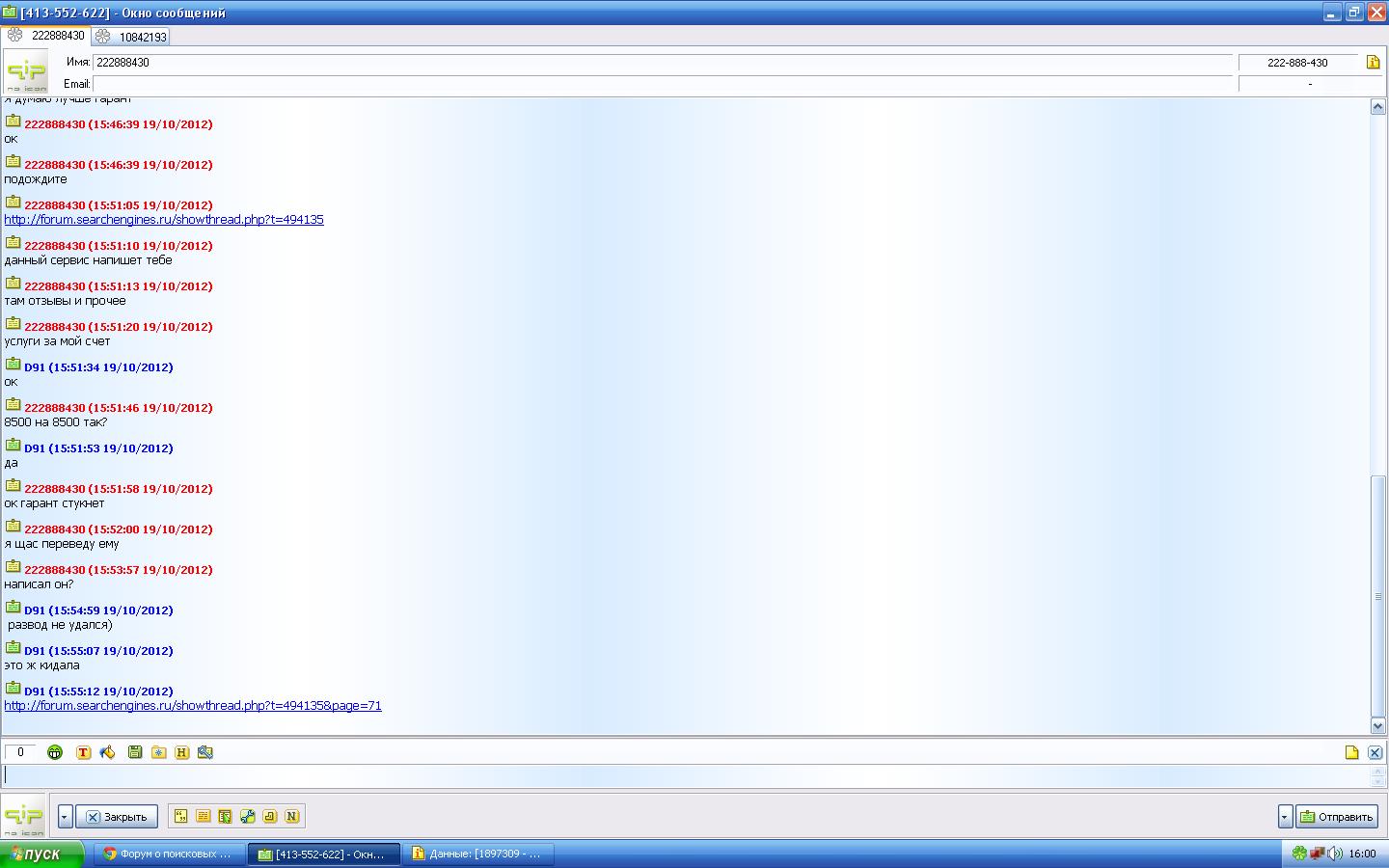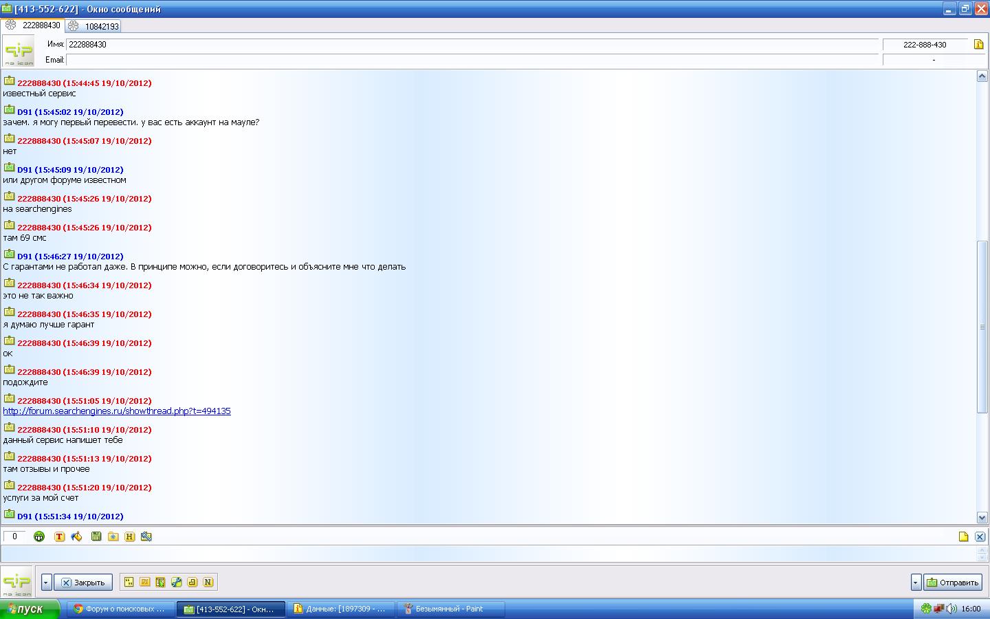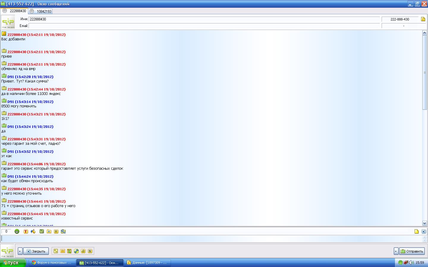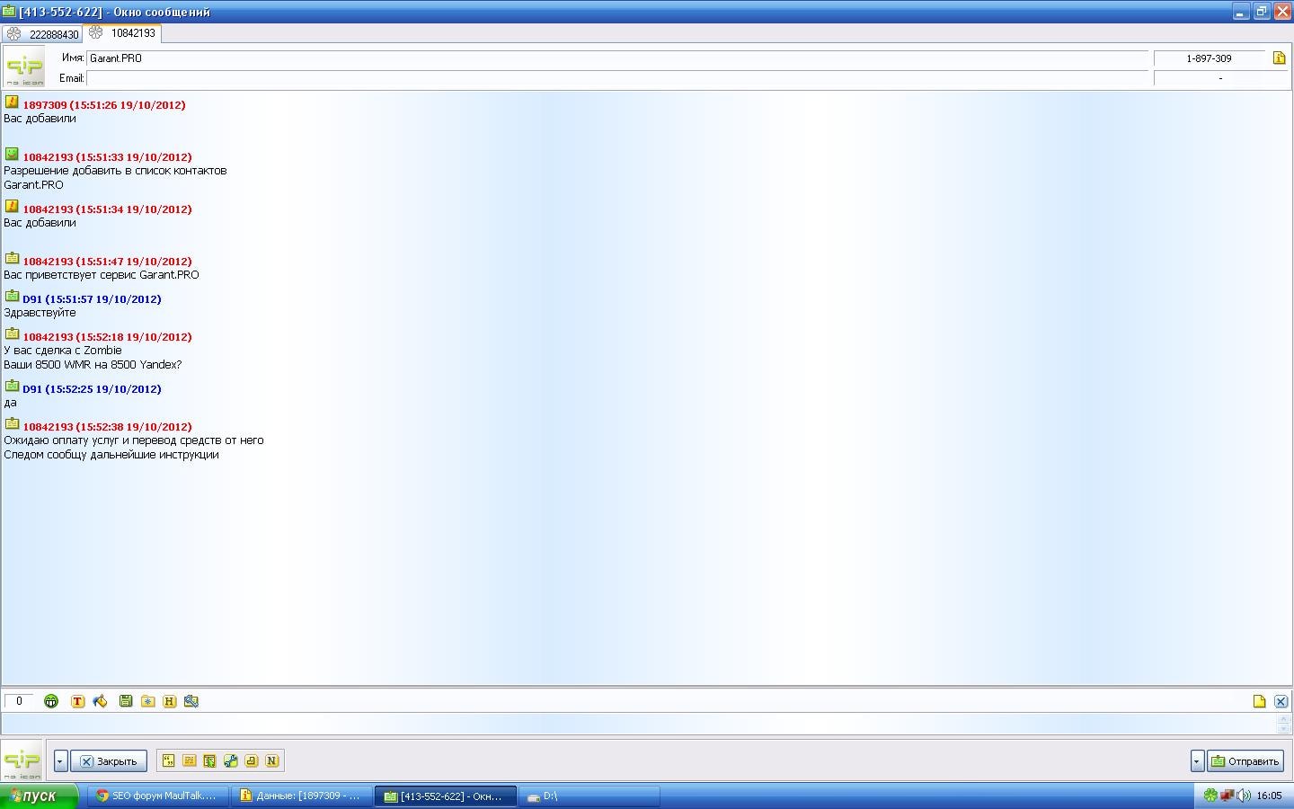 Спасибо. Чуть не клюнул! В последний момент тут прочитал ваше сообщение. Я на одном форуме написал объявление, что хочу обменять WMR на ЯД, написал с аськи 222888430 какой-то чел и настаивал на сделке с гарантом: якобы аккаунтов на форумах у него нет. Ну я говорю лады, договаривайтесь. Пишет мне с аськи 1-897-309 (а логин то "10842193") якобы GARANT.PRO и предлагает обменять средства)) Тут я на форуме и прочитал сообщение)