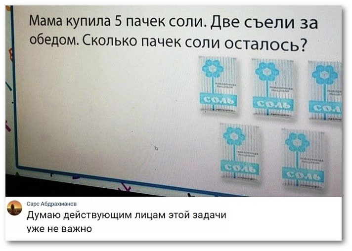 Может, там семья на 100 человек. 2 пачки соли = 500 г, каждому по 5 г. Всё в порядке.