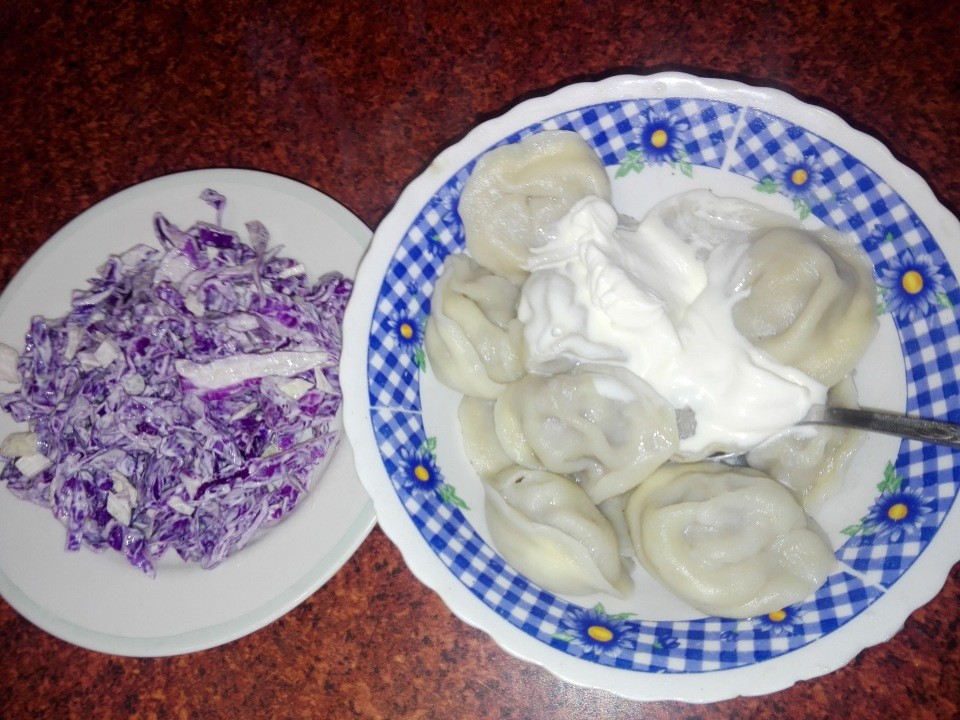 На ужин пельмешки без спешки и салат из любимой капусты, которую сам вырастил :)