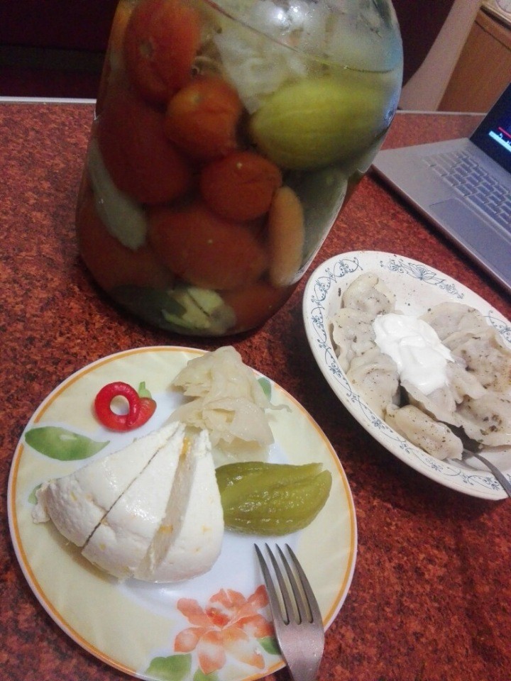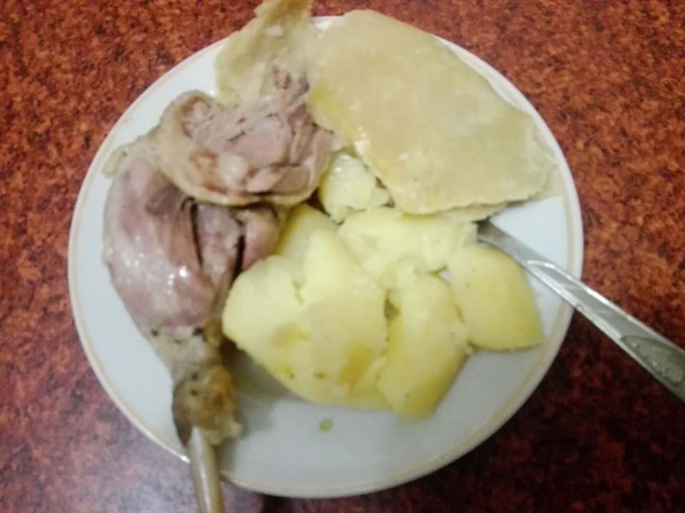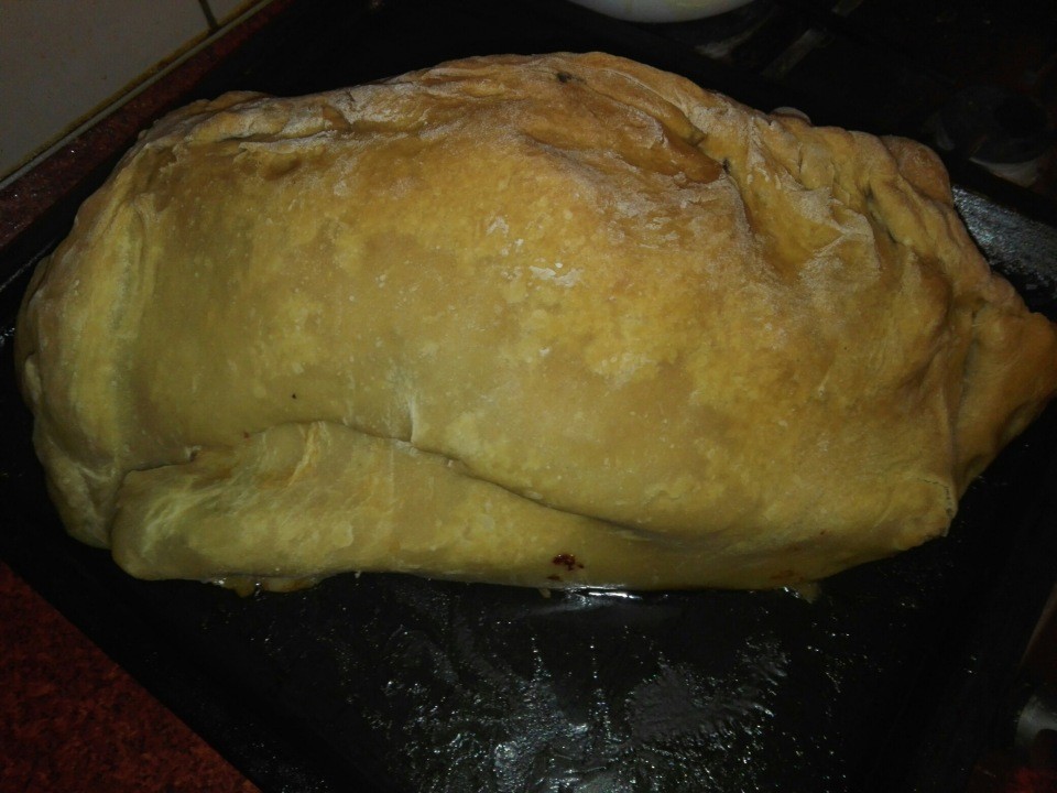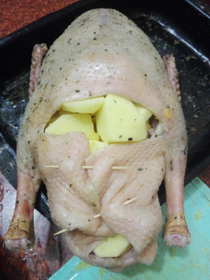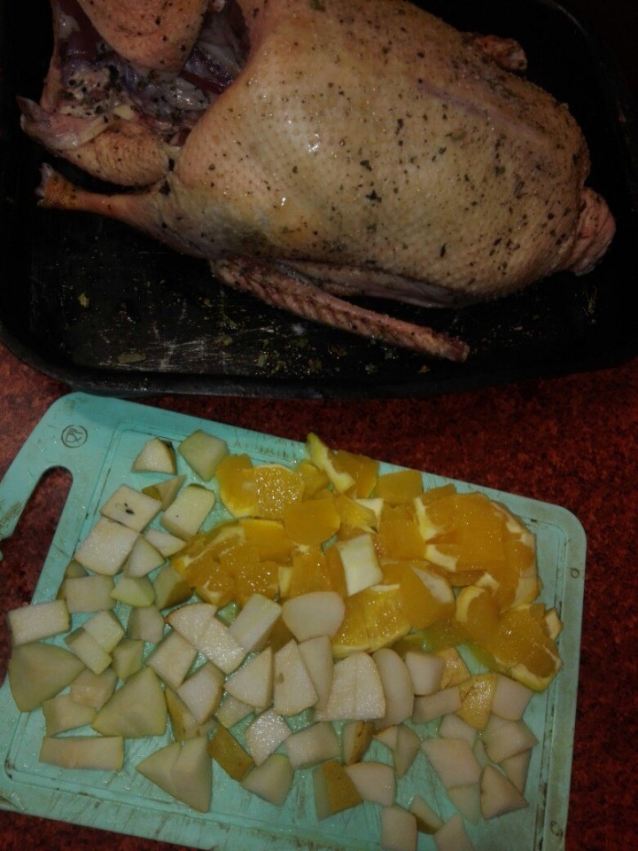 Гусь запечённый в тесте с апельсином, грушей и картошкой.