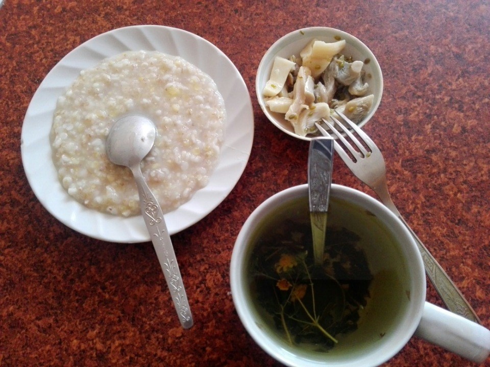 У меня сегодня на завтрак каша с груздями и фиточай :)