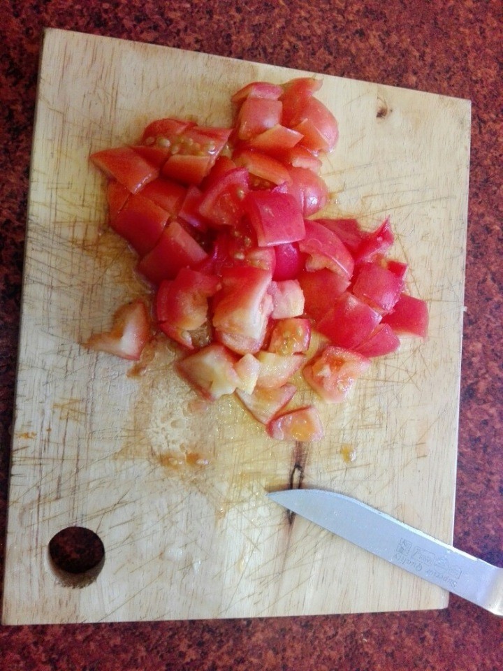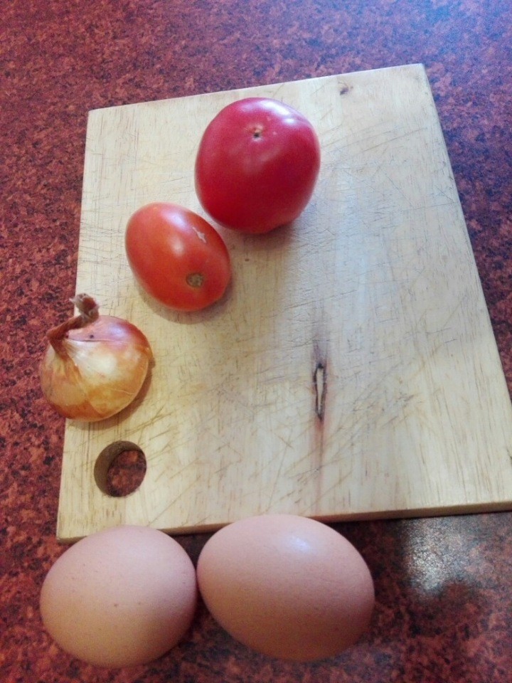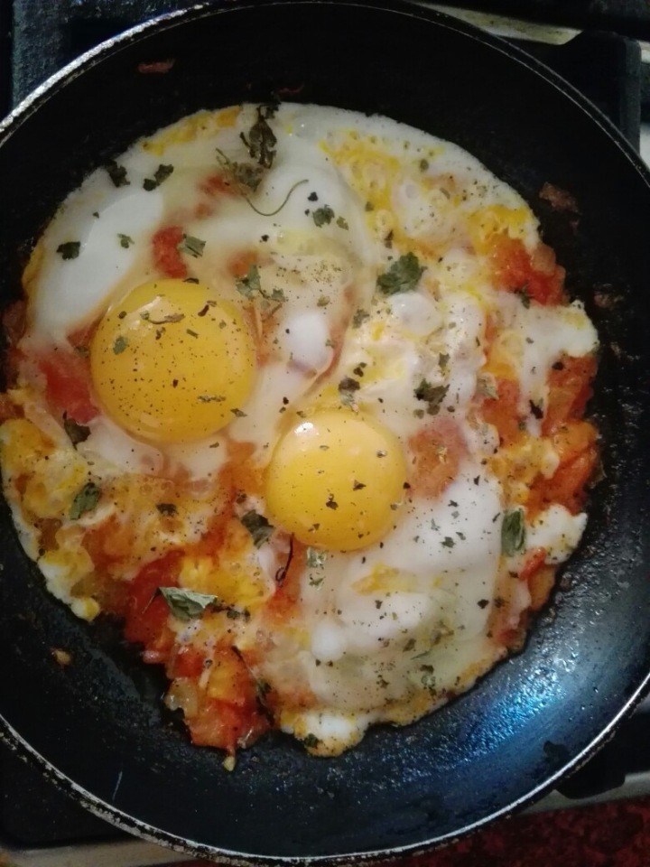Обжарил лук, следом томаты, посолил и после заливаю яйцами. Опять немного солю, добавляю специи.