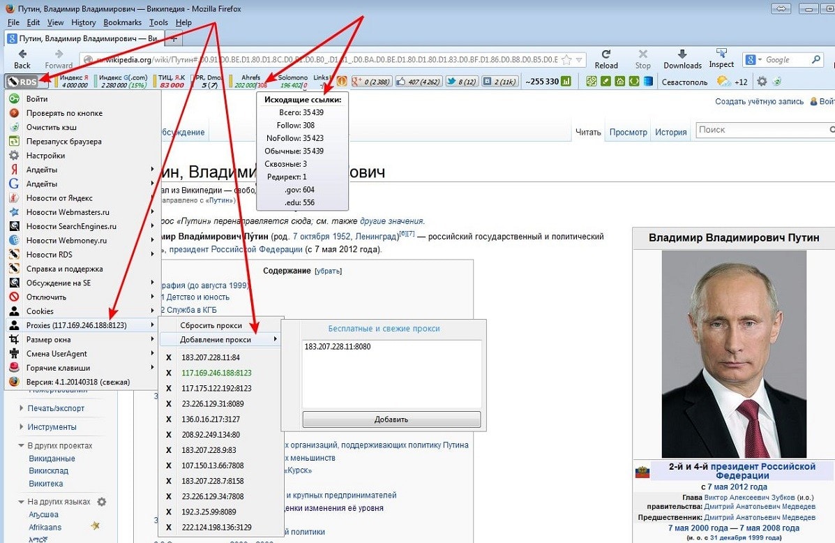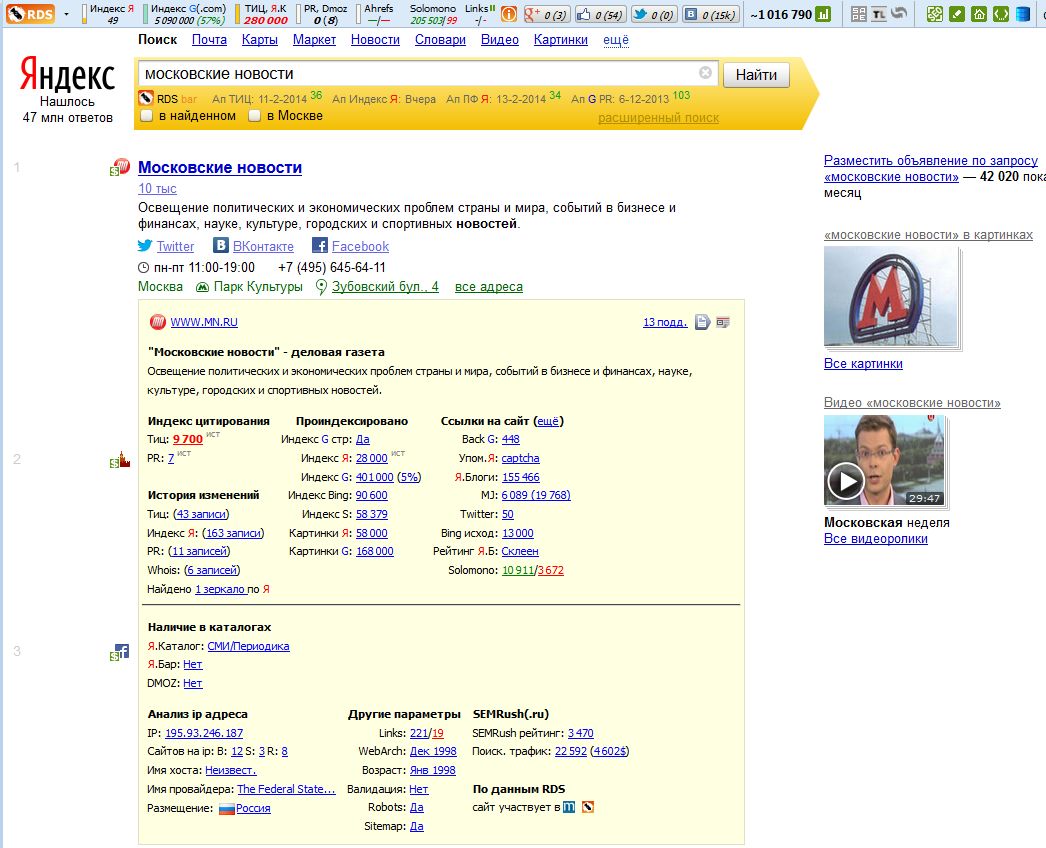- вывод параметров ТИЦ, Я Каталог, ТИЦ.Бар, Я Регион, Я Тематика, Индекс Я, Индекс Я дата.стр, PR, DMOZ, Индекс G, Индекс G стр, Продажа SEO, Посещаемость, Links in/out, Покупка ссылок, Индекс Solomono, Solomono in/out, MozRank, SEOmoz, Web Arch, Возраст, Alexa, Semrush, Позиции, Позиции стр, Соц. сети, Агрегаторы, Картинки, Упом. Я, Back G, Back Alexa, Ahrefs, MJ, CF, TF, Индекс Bing, Back Bing, Bing исход, Индекс AOL, IP, Сайтов на IP, Хост, Провайдер, География, CMS, Размер страницы, Время загрузки, Валидатор, Вирус, RSS