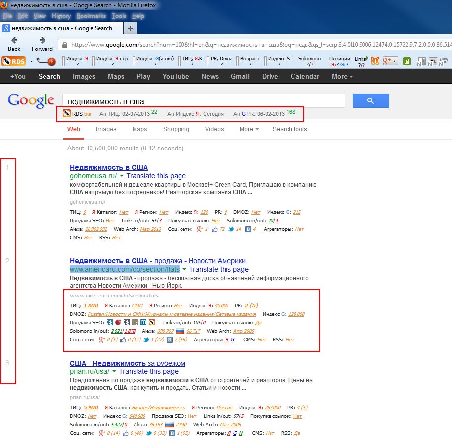 - Нумерация - нумерация результатов поисковой выдачи Google.